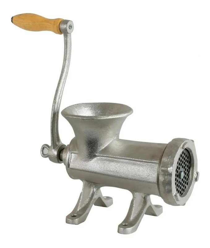 Es un utensilio de cocina diseñado para moler carne y otros alimentos en trozos más pequeños o en una consistencia de carne molida. Consiste en un dispositivo que generalmente incluye una tolva en la parte superior donde se introduce la carne, un mecanismo de trituración compuesto por cuchillas o discos y una manivela o motor para hacer girar el mecanismo de trituración. Se utiliza principalmente para preparar carne molida para diversos platos, como hamburguesas, albóndigas, salchichas, entre otros. También puede utilizarse para moler otros alimentos, como verduras, nueces o granos, dependiendo del diseño y las capacidades del molino específico. Los molinos de carne son comunes en cocinas domésticas y comerciales, ofreciendo una forma eficiente de procesar carne y otros ingredientes para la preparación de alimentos.