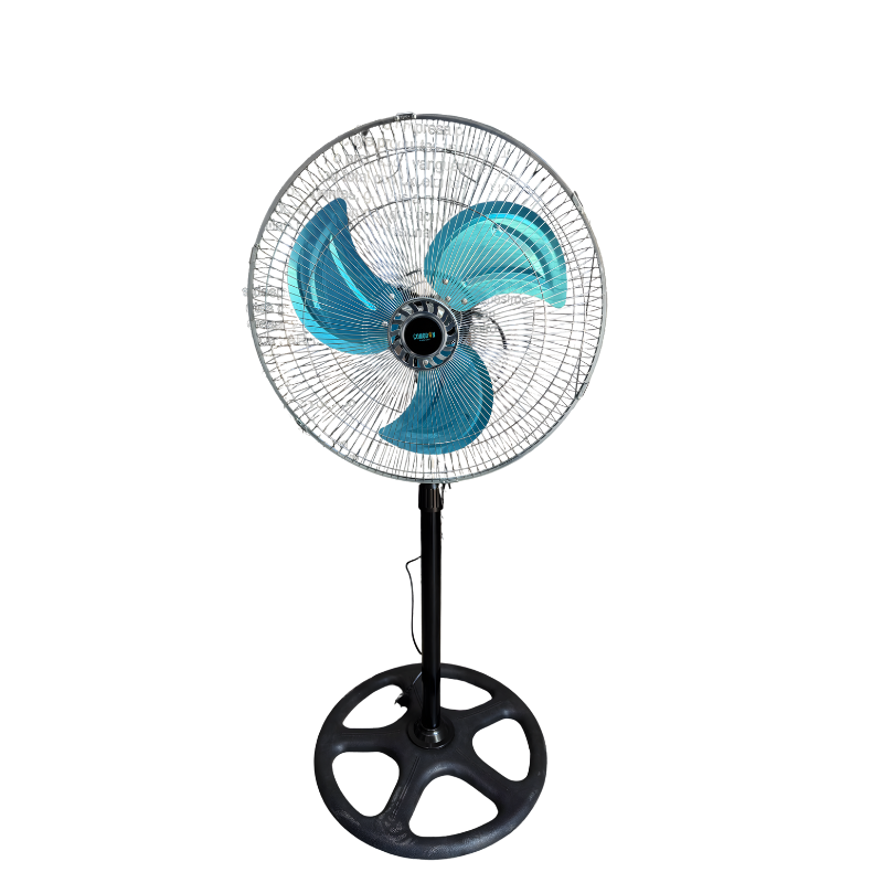 Es un tipo de ventilador que se coloca en el suelo y tiene aspas de metal para generar flujo de aire.